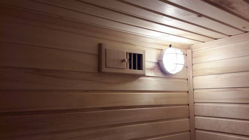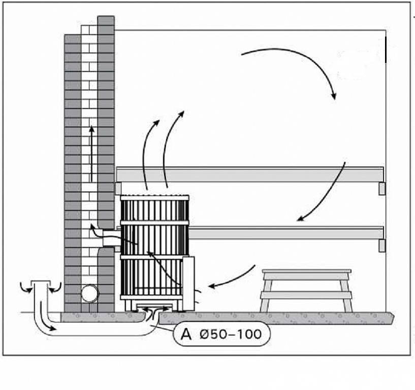 - Вытяжное отверстие для естественной вентиляции устанавливается на противоположной стене от печи под потолком, и на момент, когда люди заняты процедурами, закрыто.