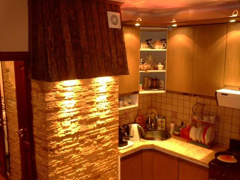 В силу особенностей планировки кухни между вентиляционной решеткой в стене и местом установки вытяжки образуется достаточно большое пространство. Хотя воздуховод технически несложно протянуть от вытяжки к вентиляции с помощью гибкой гофрированной трубы, но на практике это портит эстетику кухни.