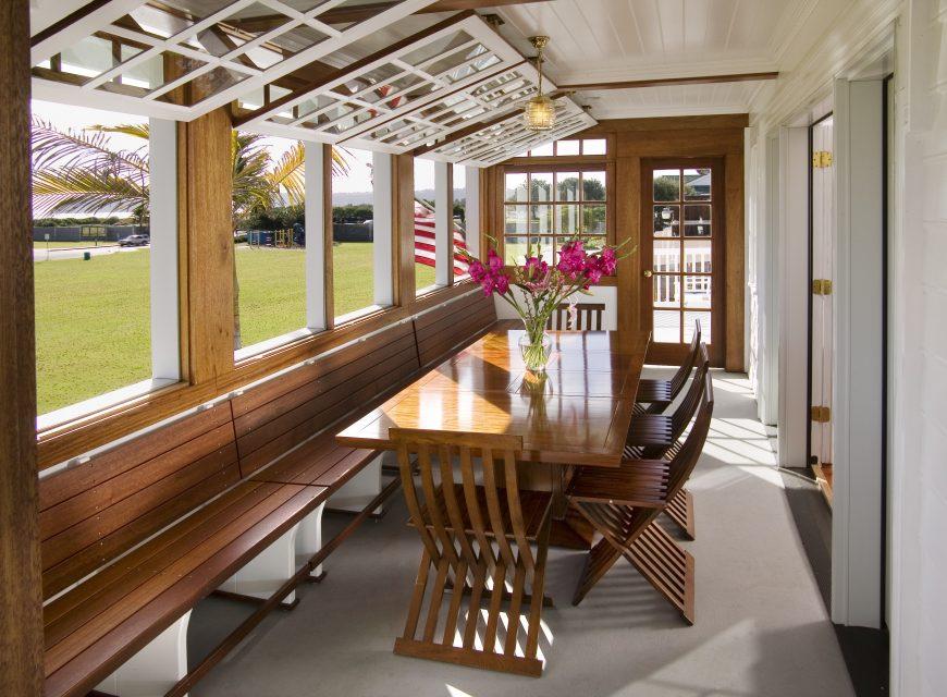 Если вы построите полностью закрытую веранду, то на ней можно устроить полноценное помещение для приема пищи, гостиную или кухню