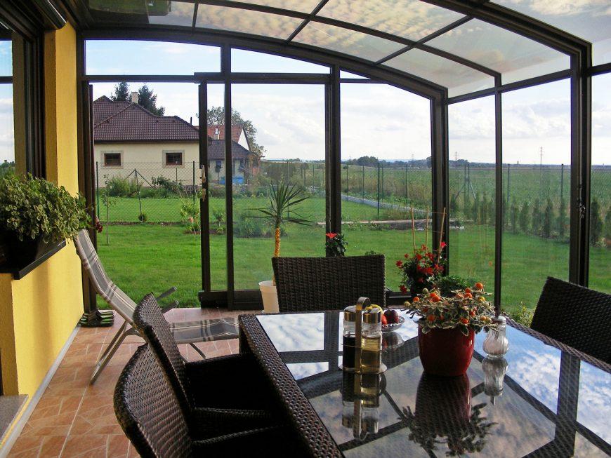 Если дополнительно такое помещение утеплить и осуществить двойное остекление, то, при наличии в нем отопления, можно приятно проводить время на веранде в любое время года.