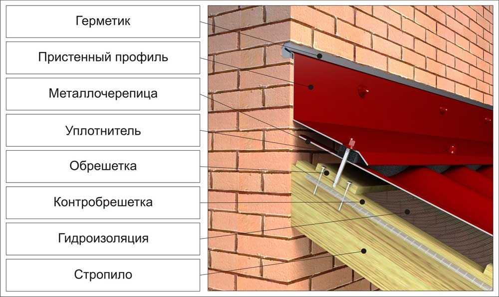 Чаще всего оказывается, что крыша веранды, пристроенной к дому, примыкает к стене. В этом случае в стене делается строб, в него вставляется специальный стеновой профиль, который второй стороной ставится на кровельное покрытие. Приставка его столба к стене заделывается герметиком.