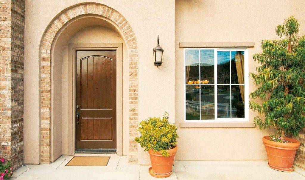 Дверь должна подходить по своему внешнему виду к цветовому и стилевому решению фасада дома, смотреться уместно и гармонично на этом фасаде.