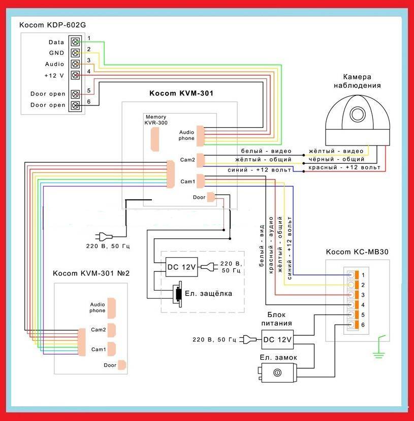 Схема подключения расширенного комплекта устройств видеодомофона Kocom.