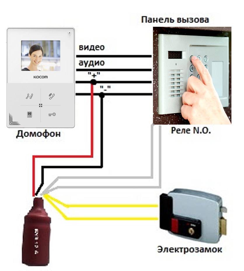 Два аппарата связанные между собой или с аудио-трубкой могут работать в режиме интеркома. Управление замком может идти по стандартной схеме – через реле вызова или быть подвязано к отдельной кнопке на лицевой панели, которая размыкает контактное реле типа N.O.