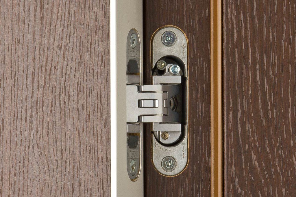 Этот вид изделий выигрывает по всем параметрам. Установка петель осуществляется непосредственно в дверное полотно и коробку. Это основное и кардинальное отличие скрытых изделий. Эта особенность наделяет скрытые навесы такими преимуществами, как: