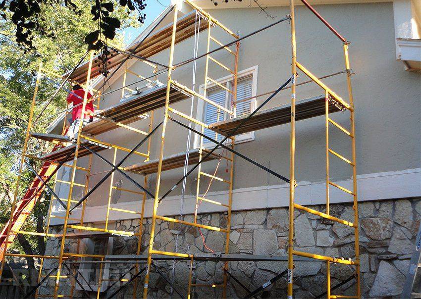 Для облицовочной кладки нужно иметь строительные леса. Их можно сделать самому из пиломатериалов (долго, дорого и опасно) или пользоваться металлическими заводскими. Рекомендуем применять заводские, они полностью отвечают требованиям по технике безопасности. Еще один плюс – по мере кладки высота рабочей площадки быстро изменяется. Леса должны монтироваться только на устойчивых площадках, если такой нет, то нужно пользоваться упорами.