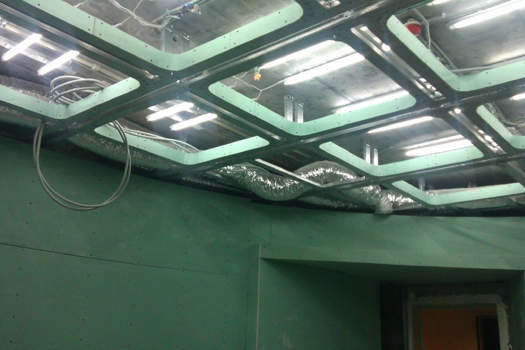 Особенность гипсокартона в методике его монтажа – листы крепятся к предварительно смонтированному основанию в виде каркаса, выполненного из оцинкованного профиля. Примечательно, что путем деформации металлических реек можно получить не только прямоугольную форму, но изогнуть по кривым линиям, сложные геометрические фигуры. Вот в чем секрет получения разнообразных конфигураций, например, экстравагантных куполов, арок и т.п. Если самостоятельно сложно понять, как делается подвесной потолок, то следует обратиться к мастеру