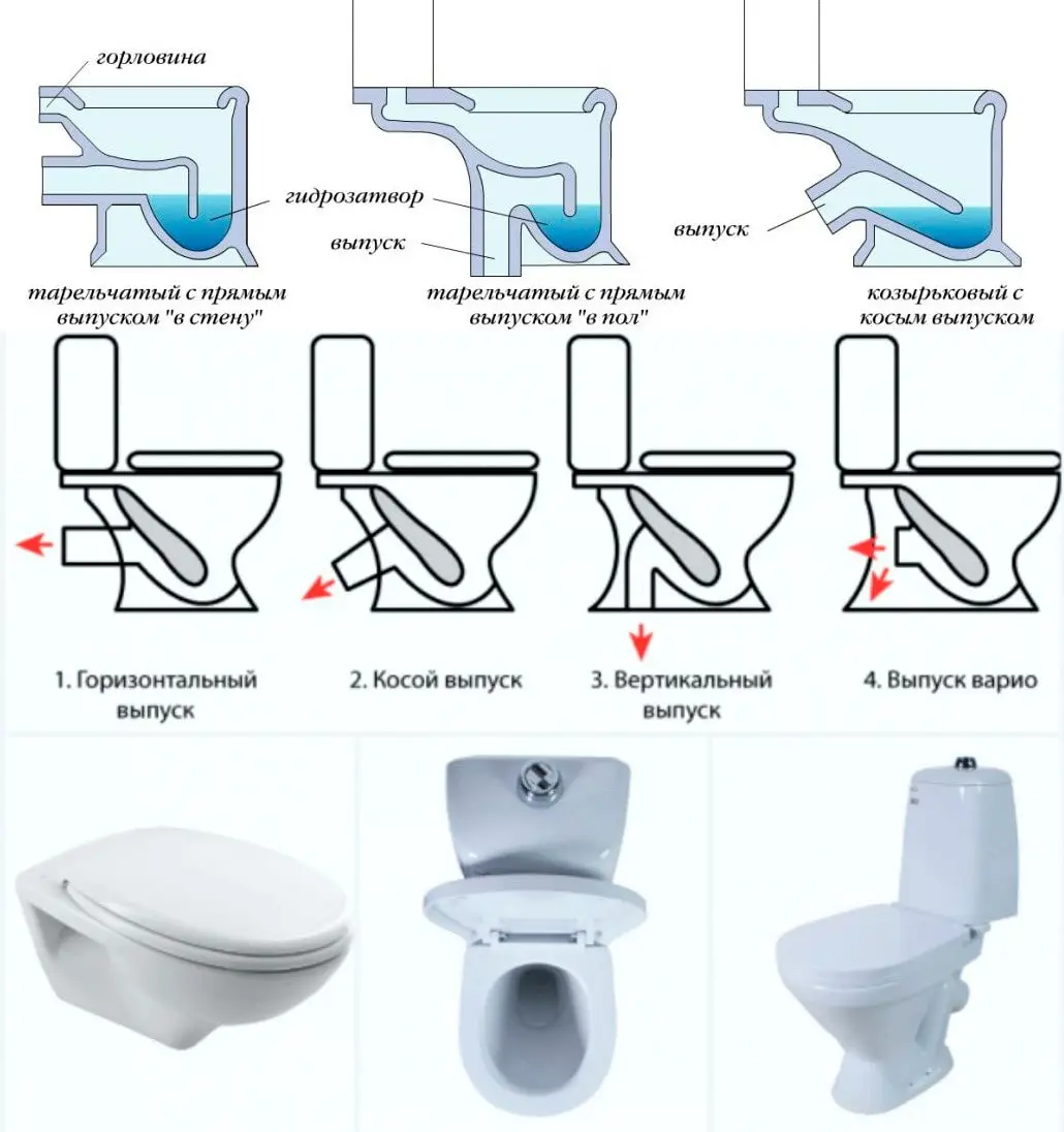 Конструкция сливного выхода унитаза имеет огромное значение, и напрямую зависит от вида канализационной системы. В продаже имеются горловины унитазов следующих видов: