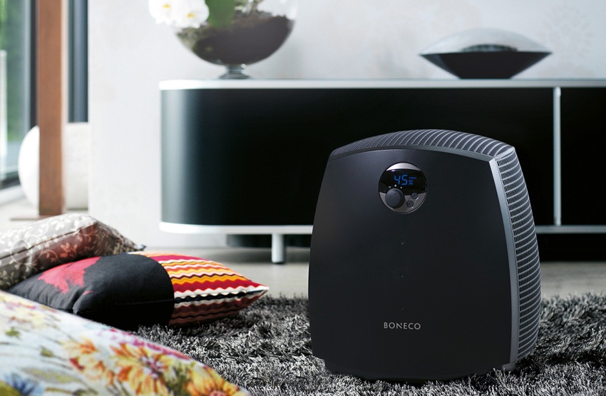 Наиболее оптимальный и современный способ повысить влажность в квартире — купить увлажнитель воздуха. Этот прибор рассчитан, в основном, на помещения площадью до 150 м³. В специальную емкость увлажнителя наливается вода, которая испаряется при работе прибора.
