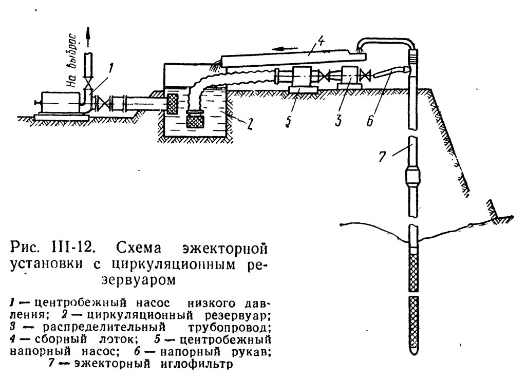 На рисунке показана схема эжекторной установки с циркуляционным резервуаром. При такой системе вода, выбрасываемая из иглофильтра, попадает в контейнер, а затем сливается в циркуляционный резервуар. Потом часть жидкости высасывается насосом, а другая часть выводится за пределы траншеи.