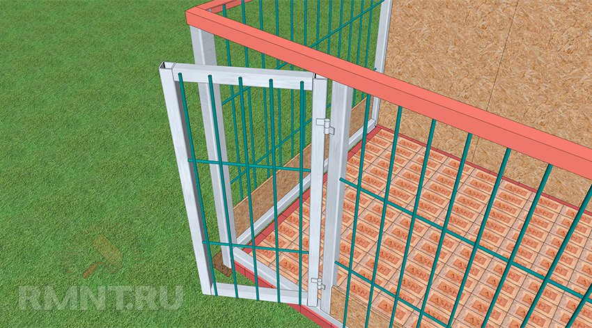 Дверь в вольер должна позволять свободно войти хозяину для уборки и ухода за питомцем. Самый простой вариант — установить заранее два столба на дистанции около 80–100 см, формируя тем самым проём калитки. Чтобы не корпеть над изготовлением фрамуги, калитку можно сделать в полную высоту вольера. Естественно, такой вариант возможен лишь со стороны передней или задней стенки, на боковых придётся компенсировать наклон кровли.
