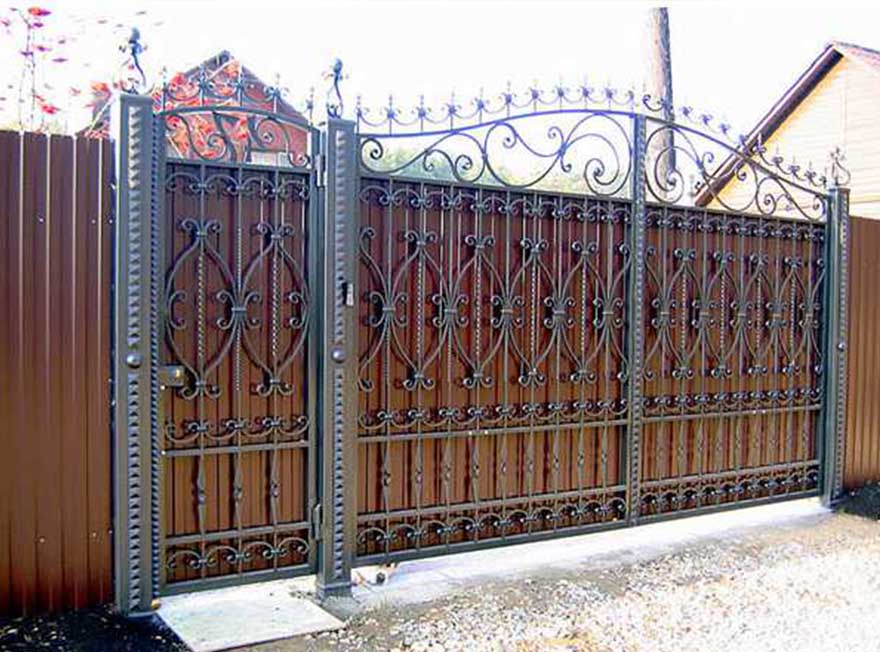 Когда выбирается отделка каркаса профнастилом, створки становятся похожи друг на друга. При изготовлении ворот из металлопрофиля своими руками можно использовать кованые элементы. Конструкция, декорированная подобным образом, будет выделяться на фоне остальных. Сразу меняется стиль оформления, изделие становится более привлекательным.