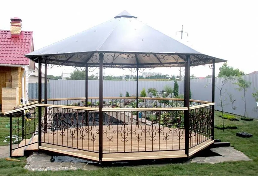 Альтанка из металла выходит прочной, монолитной и долговечной. Она имеет привлекательный внешний вид, особенно если добавить кованые элементы. Однако есть два основных нюанса – высокая стоимость сырья и дополнительный труд из-за большого количества элементов и сложности работ.