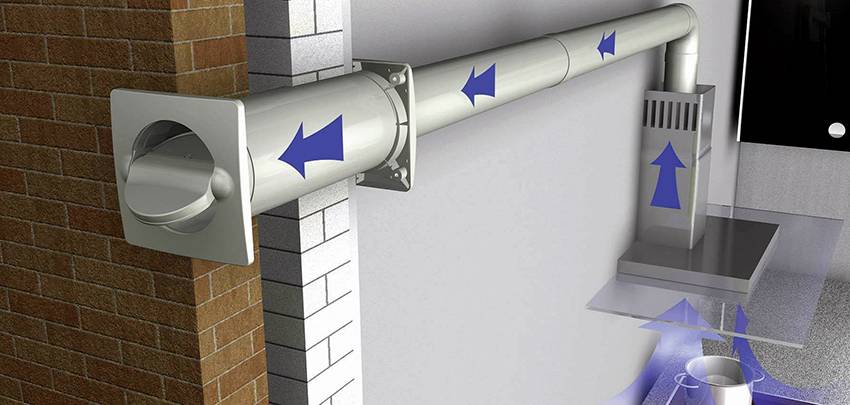 При монтаже конструкции следует подумать и об обеспечении естественного притока воздуха – ведь труба займет все вентиляционное отверстие. Для этого на вход в шахту крепится специальная решетка с отдельным клапаном, который будет открывать путь для поступления свежего воздуха.