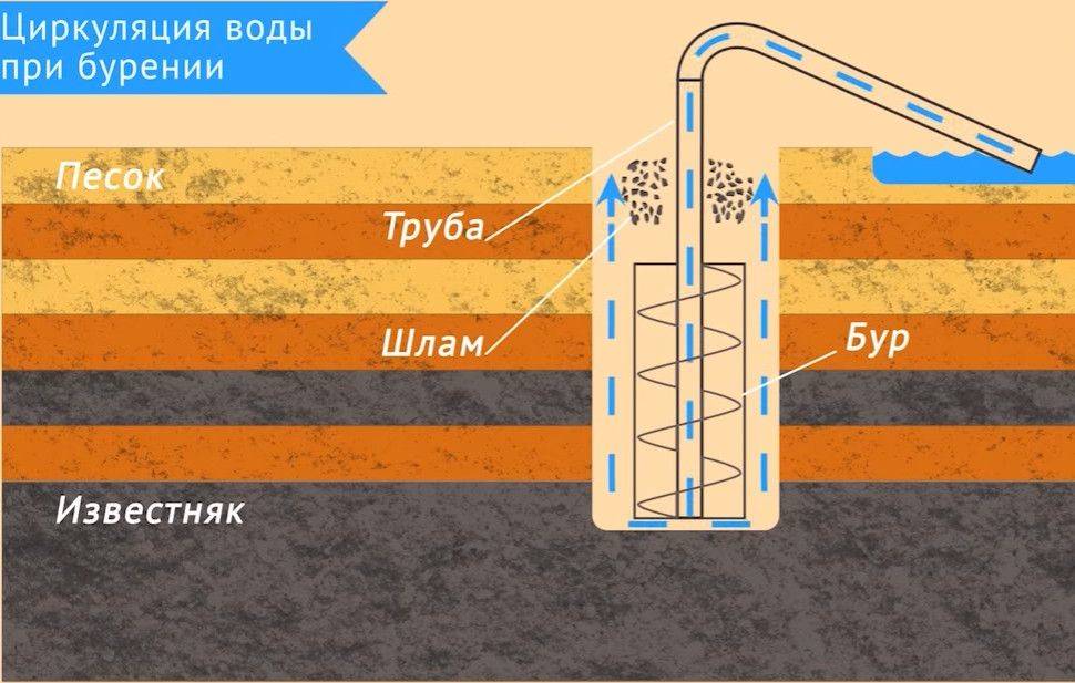 Метод гидравлического прохождения породы заключается в бурении скважин водой, под давлением подаваемой в углубление. Напор глинистого раствора, состоящего из смеси глины и воды, размывает породу и поднимает на поверхность. Используют напор одновременно с работой бурового снаряда. Жидкость выполняет функции: