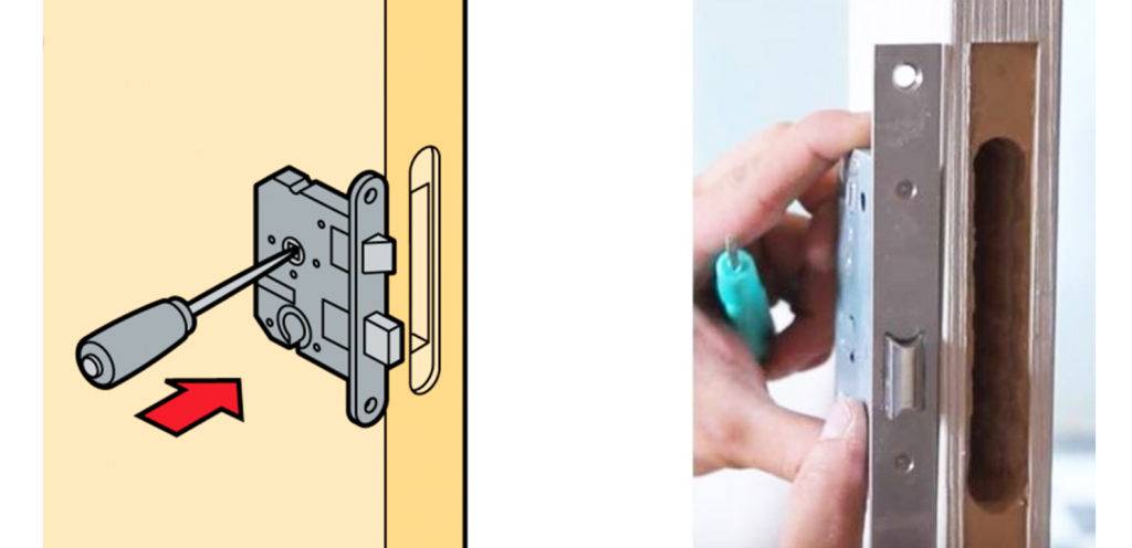Из углубления необходимо удалить стружку, после чего поместить туда замок. Планка ригеля прикрепляется при помощи саморезов к боковой части двери, а затем выполняется установка дверной фурнитуры.