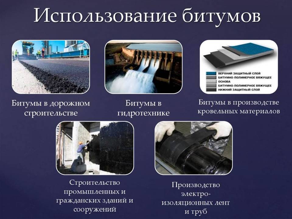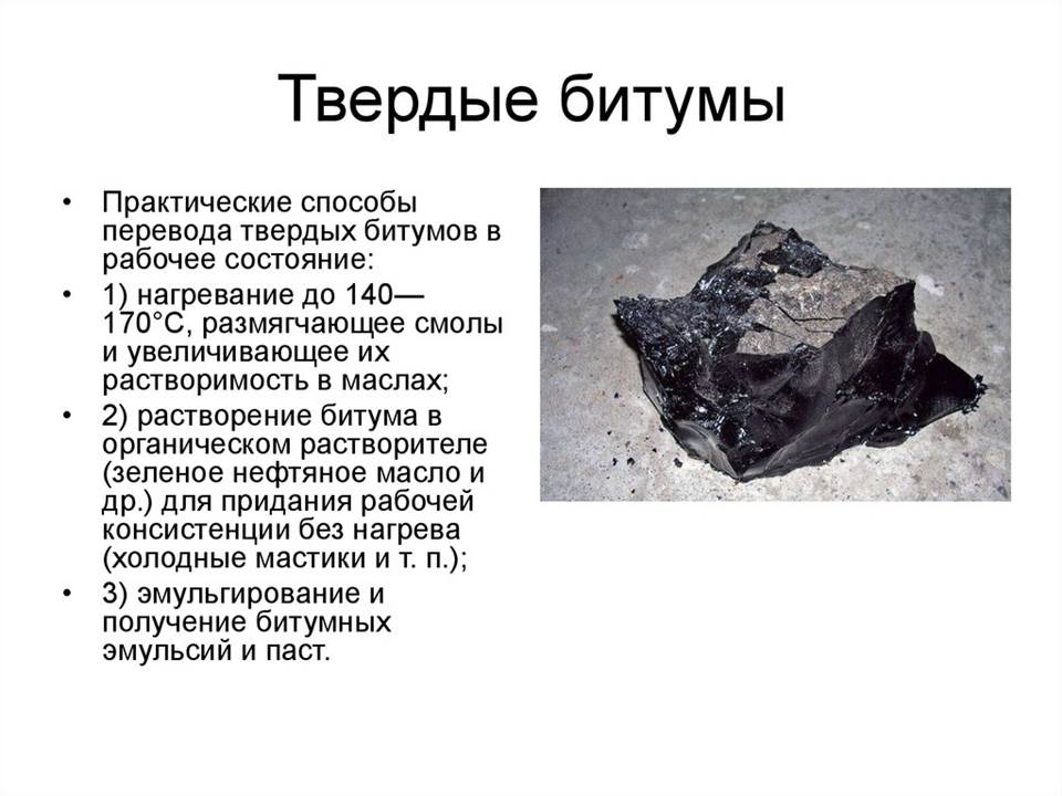 При температуре 80-160°С или при добавлении растворителей (керосин) битумы переходят в жидкое состояние. При охлаждении (до 20-25 °С) или испарении растворителя битумы затвердевают. Материалы, покрытые битумом, приобретают гидрофобные свойства,
