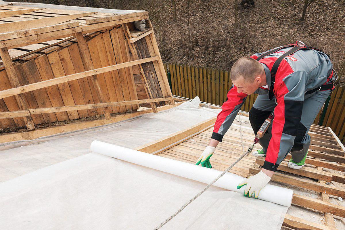 Шаг 2 – раскатка полотна по обрешётке | Работы по монтажу ведут два человека, так как одному это делать было бы неудобно. Рулон раскатывается параллельно карнизу, двигаясь к нему, начиная от конька. Между полотнами обязательно делается нахлёст до 15 см с заходом на стены. |