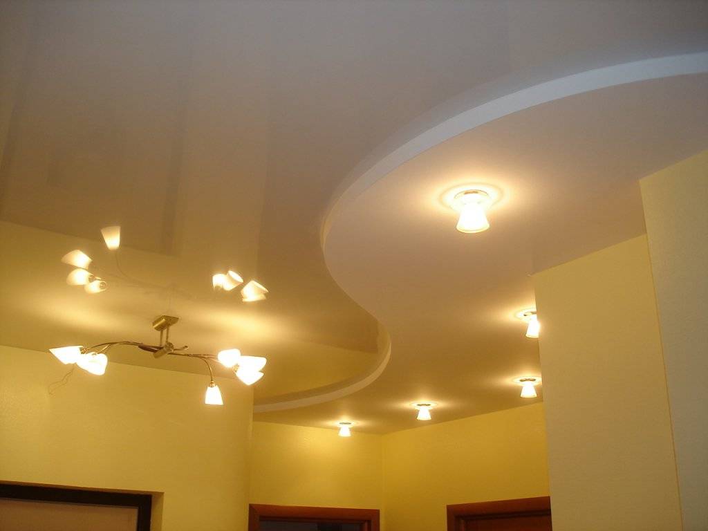 Варианты освещения зависят от конфигурации фигур и их расположения. Чтобы создать эффект парения покрытия, подсветка устанавливается в короб, выполненный по периметру, либо непосредственно за ним. В основную горизонтальную плоскость устанавливают точечные встроенные светильники или применяют навесные приборы.