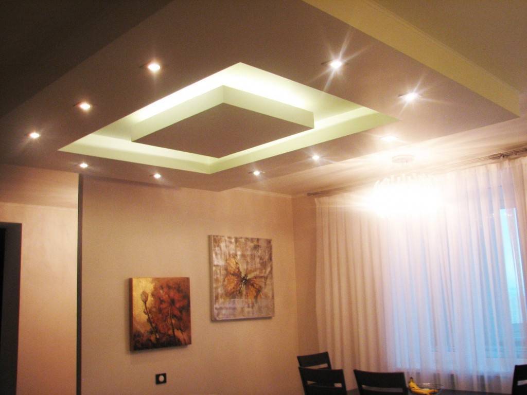 Скомбинированные гипсокартонные потолки позволяют сочетать и разнотипные виды осветительных приборов, которые подчеркнут достоинства комнаты или наоборот скрою ее недостатки. Например, используя точечные светильники по периметру, рассеяв, таким образом свет, можно получить эффект расширенной площади и объема комнаты.