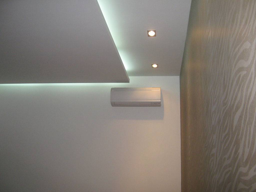 - Различные виды двухуровневых потолков из гипсокартона часто делаются с закарнизной подсветкой. Для этого в нижнем ярусе выполняют специальную полку, на которой прокладывают светодиодную ленту.