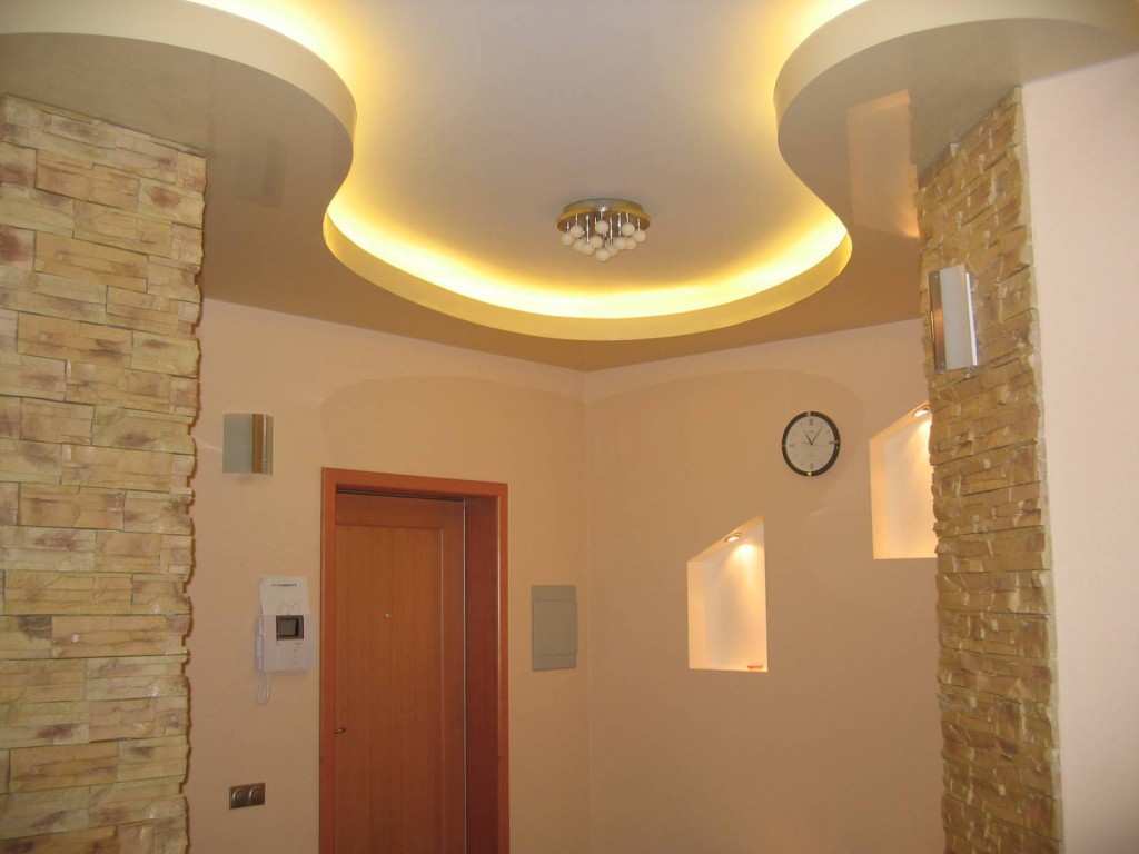 Чтобы сделать помещение более объемным, а также расширить пространство, рекомендуется сделать акцент на центральной части при помощи потолка из гипсокартона.