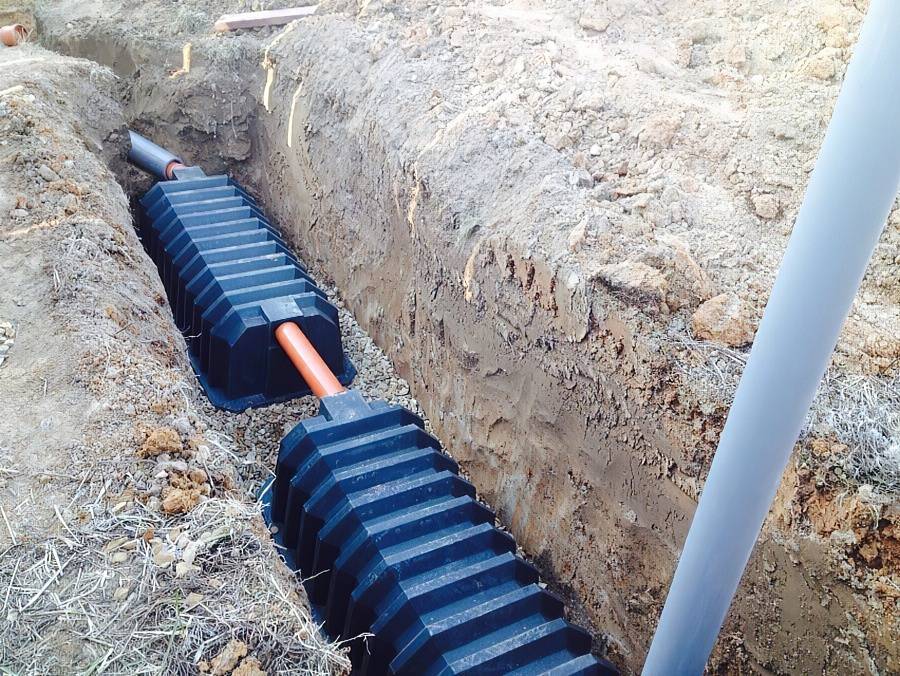 Вместо поля фильтрации удобнее и проще, но дороже установить инфильтраторы. Главное условие для их сооружения как и для поля с поглотительным колодцем – расстояние между грунтовыми водами и низом систем не менее метра.
