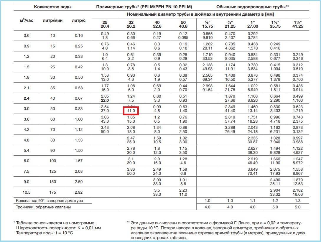 В колонках указаны два ряда цифр, нас интересует только нижний показатель с обозначением потерь на 100 метровом участке трубопровода (данные приведены в метрах). Для более точных расчетов в таблице указаны потери в коленах, запорной арматуре, тройниках, обратных клапанах (нужный параметр также указан в метрах).