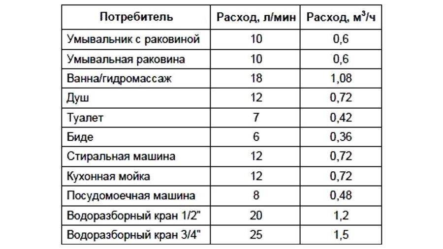 Таблица расхода воды
