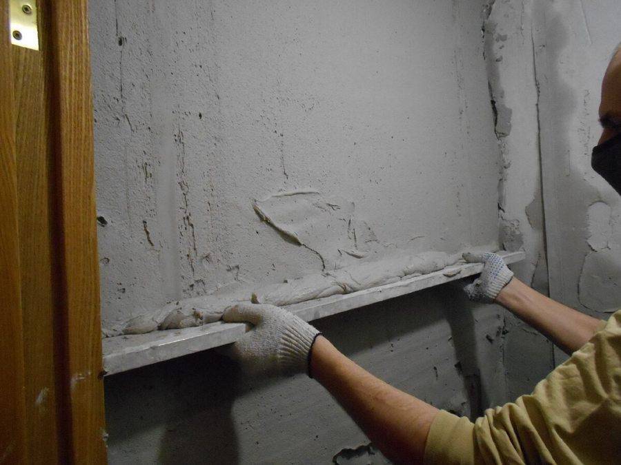Перед основным этапом выравнивания, нужно удалить с поверхности старое покрытие (обои, побелку, краску). В необходимых ситуациях удаляется хлипкая, отваливающаяся старая штукатурка по углам и других местах. На практике чаще очищается все старое покрытие до основного бетона или кирпичной кладки.