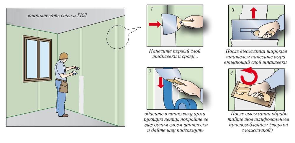 Безусловное преимущество ГКЛ – возможность идеально выровнять стены под обои или покраску. Швы (зазор 3-5 мм) шпаклюются специальными составами по серпянке. Навыки по монтажу листов нарабатываются быстро.