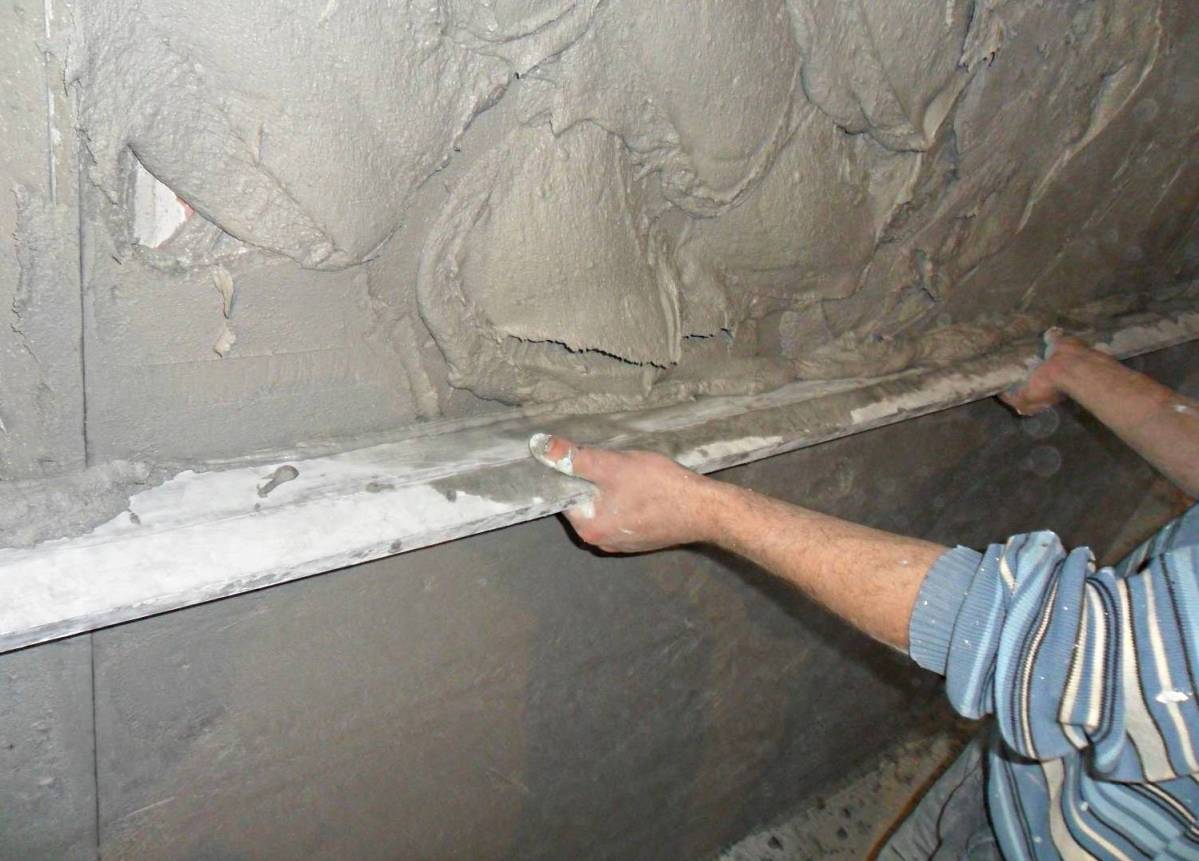 - Методом обрызга по маякам наносится штукатурный состав, излишки убираются правилом.