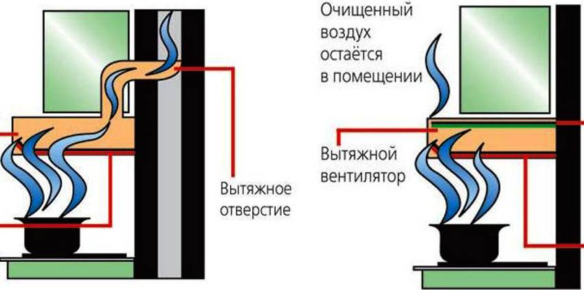 Сравнительные схемы работы вытяжки с отводом в вентиляцию и рециркуляционной