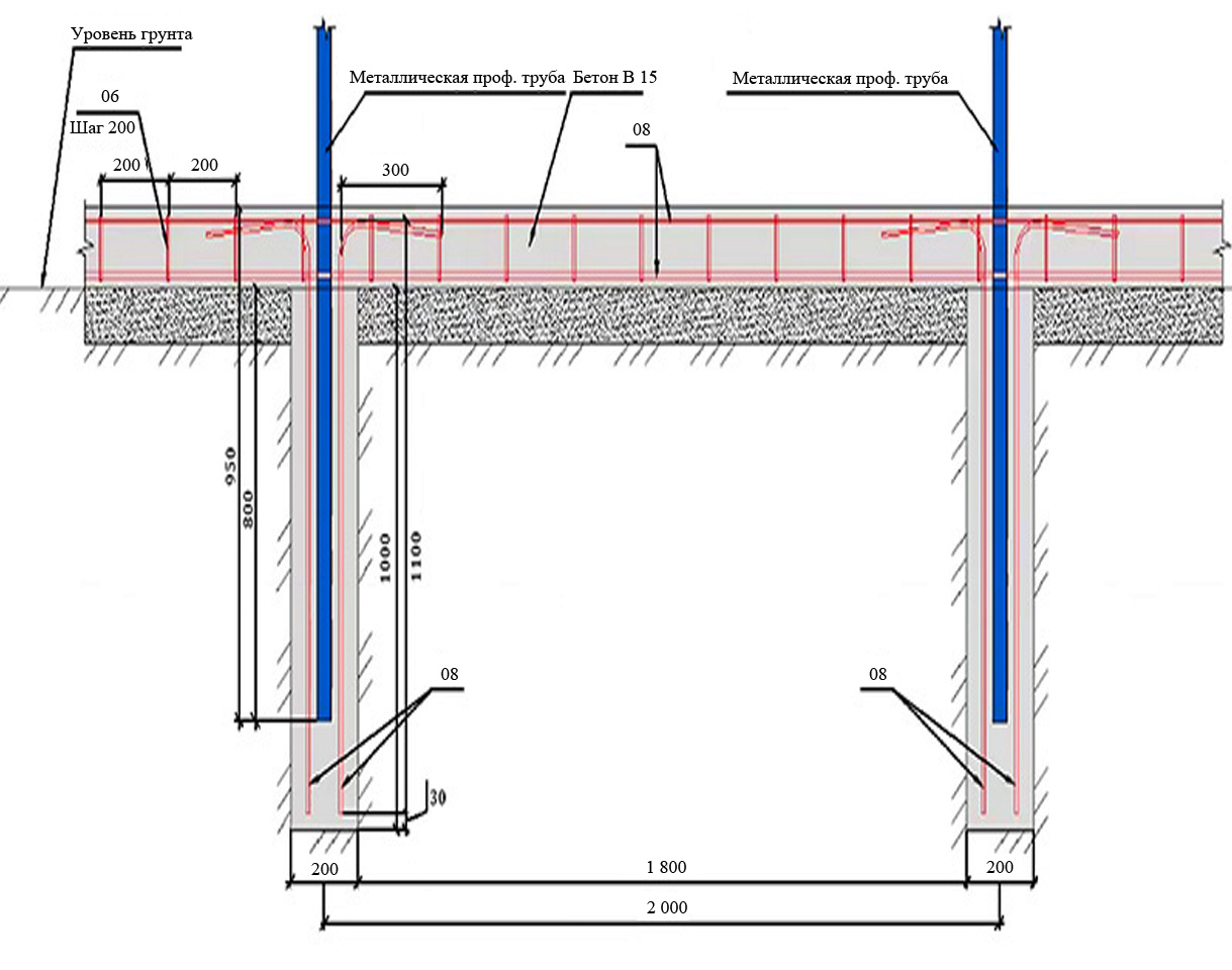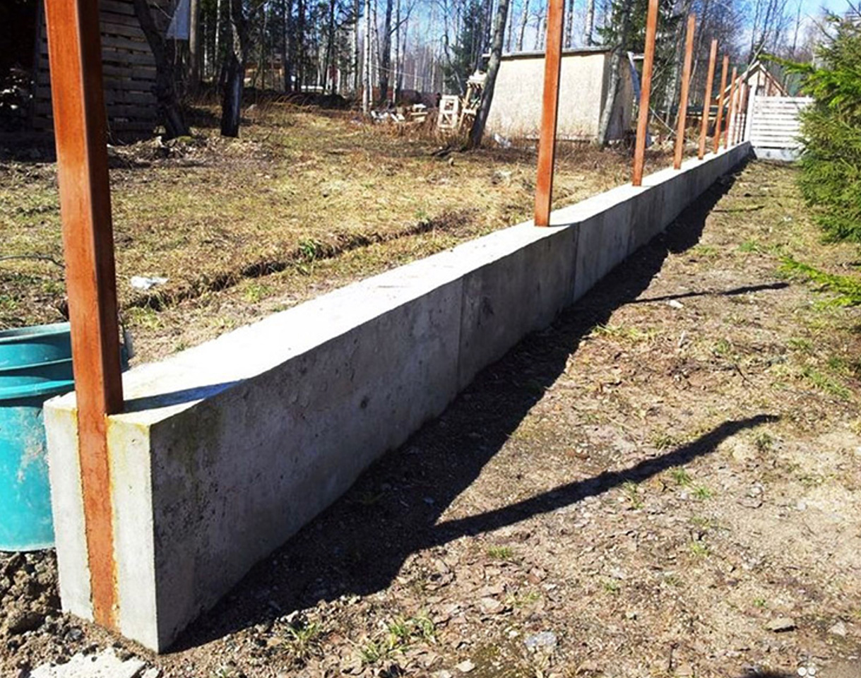 Первый этап – расчистка территории под ленточный фундамент или бруса из собственных заготовок. Над поверхностью основание должно подниматься на 10-15 см, чтобы профнастил не вступал в контакт с почвой. МЗЛФ глубиной 300-400 мм или трубные сваи под заборы своими руками — фото которых вы видите ниже — подойдут идеально. Ширина любого фундамента определяется диаметром труб или сечением пилонов.