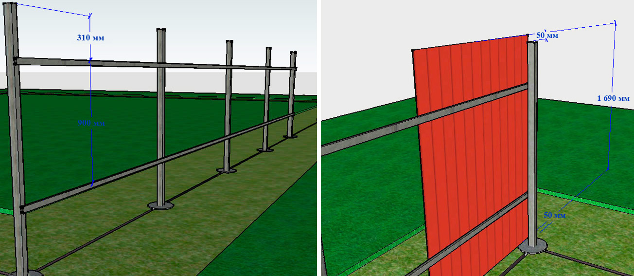 - Для опорных столбов рекомендуется использовать профильные трубы 60×60×2 мм. Стойки из дерева быстро гниют, поэтому чаще выбираются для временных ограждений. Столбы устанавливаются с интервалом 2 — 3 м друг от друга. Для определения их количества расстояние между угловыми опорами делится на длину пролета. Длина одного столба равна высоте забора плюс 1 метр, который будет закапываться в землю.