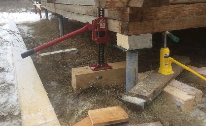 Для уменьшения веса из помещений выносят мебель, бытовую технику и разбирают пол. Нижние венцы соединяют скобами из стали. Домкраты располагают вдоль длинных перегородок, отступая от углов по 0,5 м. Под устройства ставят плиту из бетона, толщиной 50*50. В качестве временной опоры можно установить: