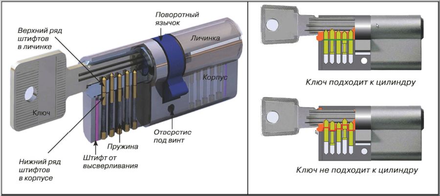 Чем больше штифтов установлено на личинке замка, тем выше уровень секретности механизма