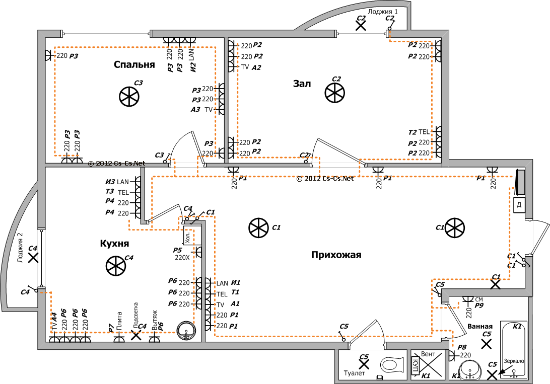 Применяя условные обозначения, на точном плане квартиры наносим места расположения всех потребителей, оборудования, соединяем линиями, которые обозначают кабель. Чтобы облегчить работу, используем разные цвета, обозначая силовую проводку, кабели для освещения и заземления.
