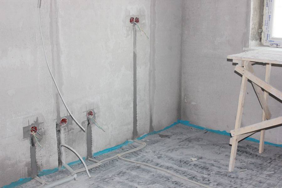 - Если монтаж проводки проводится в процессе строительства, то может быть рациональной укладка значительной части кабелей по полу до его заливки — это позволит снизить затраты на материалы и время на обустройство электросети;