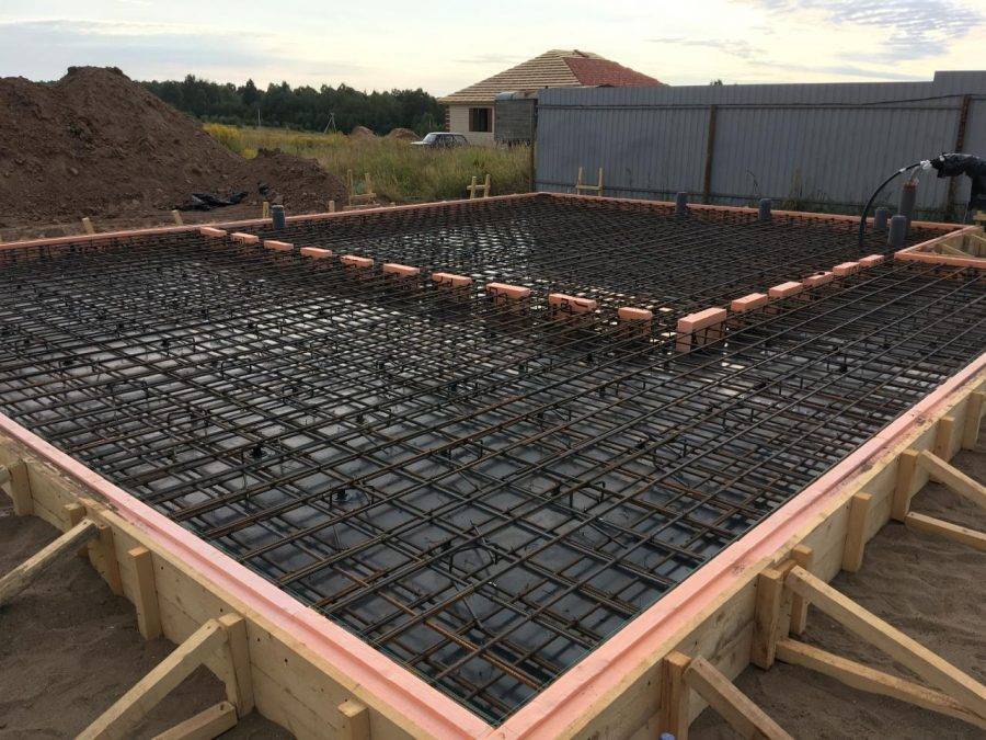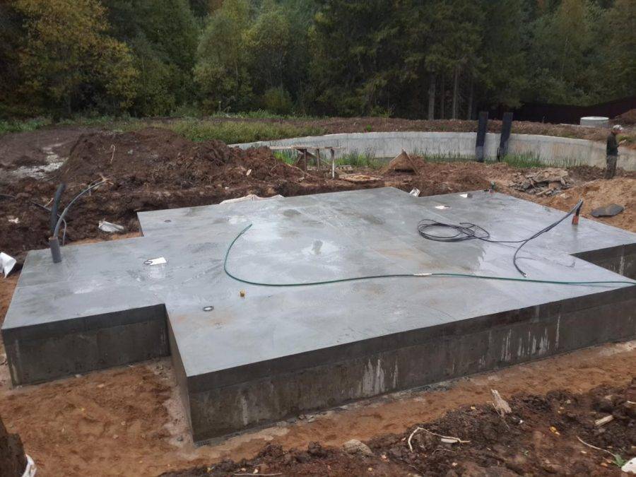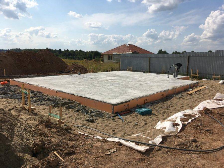 - Еще один тип высоконесущего основания – фундамент железобетонная плита. Он предназначен для сложных грунтов (переувлажненных, с неоднородной структурой, пучинистых) или строений с очень большой массой. Плитные опоры не подходят для склонов, а стоимость их строительства может оказаться самой высокой благодаря значительной материалоемкости несущей конструкции.