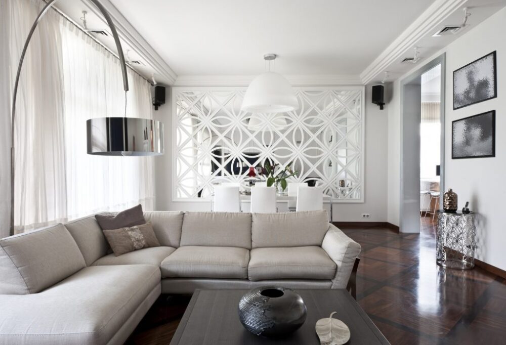 Расположенная на стенах, она поможет зрительно расширить пространство, создав иллюзию продолжения комнаты, что особенно важно для помещений небольшой площади или слишком узких. Таким образом стоит оформить длинную стену, тем самым скорректировав неправильные пропорции помещения. Это также может быть лишь часть стены, например, напротив окна, чтобы впустить внутрь больше света