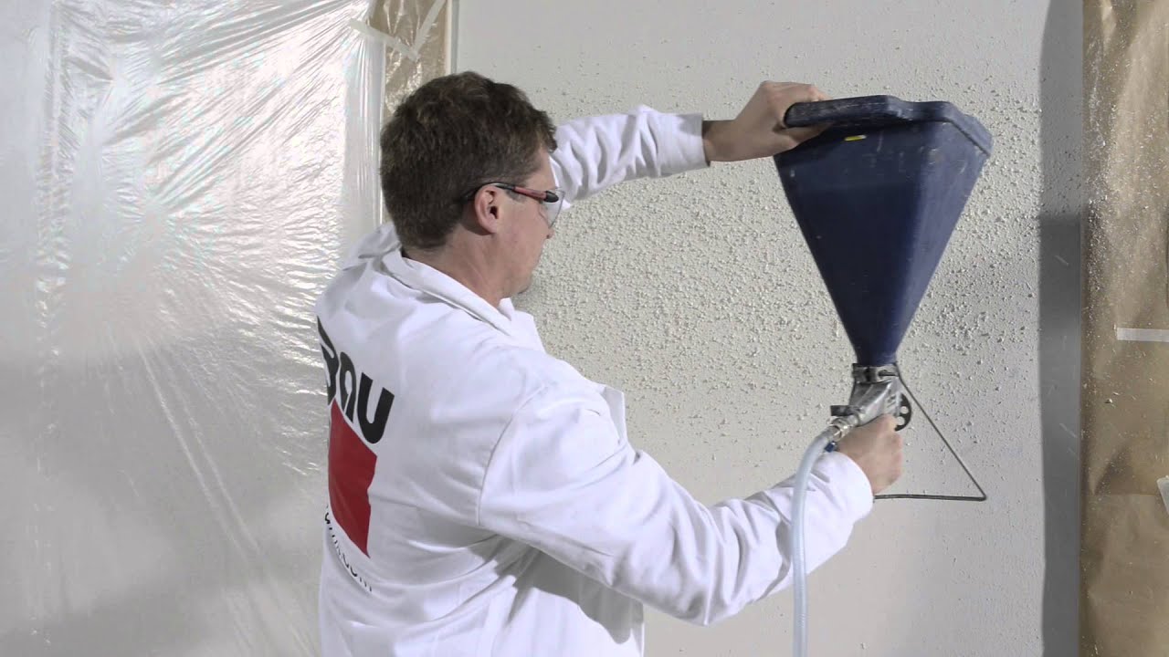 При масштабных работах удобнее наносить жидкие обои на стену пульверизатором или картушным пистолетом. Это быстрый и экономичный способ — покрытие получится более тонким и материала понадобится в два раза меньше. Исходная смесь должна иметь консистенцию жидкой сметаны, поэтому в раствор добавляют немного больше воды, чем указано на упаковке.
