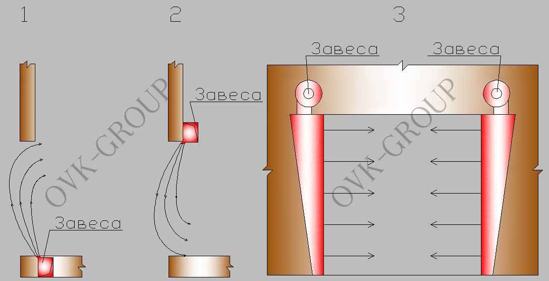 Основным назначением воздушных завес является зонирование и разграничение сред. При проектировании систем вентиляции и отопления зданий нельзя забывать про воздушные завесы благодаря ним можно сохранить тепло в зимний период и холод в летний. Завесы устанавливаются над дверями, воротами и другими открывающимися проемами для разделения наружного воздуха и внутреннего, воздушной стеной. Если завеса забирает воздух из помещения и не подогревая подает его обратно, то такая завеса называется воздушной, а если подогревает воздух то называется воздушно-тепловой. По типу установки воздушные завесы бывают с нижней подачей воздуха(1), с верхней(2) и боковой(3). Завесы с нижней подачей лучше защищают от холода в зимнее время, но могут забиваться, с верхней подачей лучше защищают холод в летнее время, боковые используются чаще всего на широких и высоких воротах.
