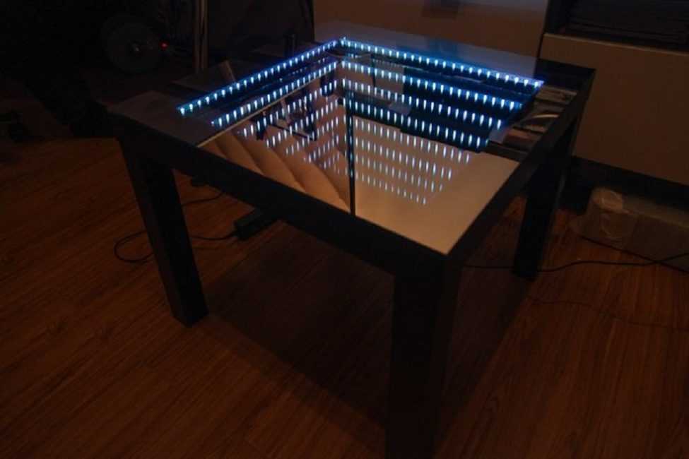 Креативный современный журнальный столик можно создать, вмонтировав в его столешницу подсветку из светодиодных лент. Стеклянная крышка в нем делается съемной, чтобы в случае выхода из строя источников света их легко можно было заменить.